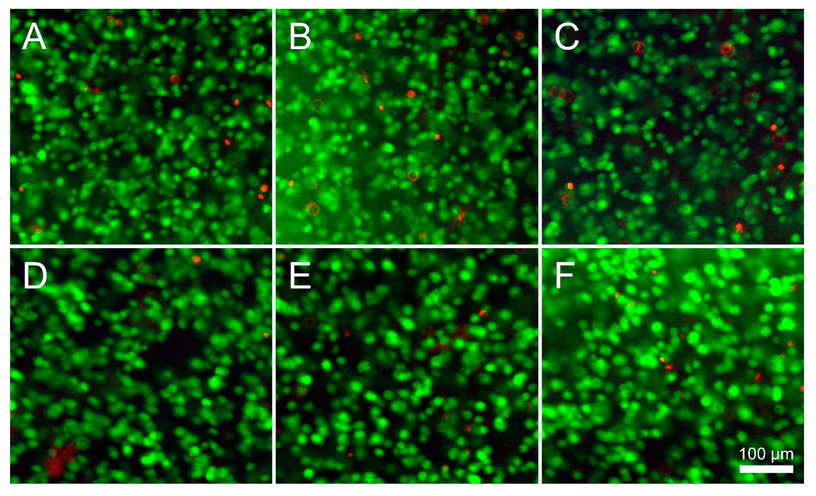 Viability was assessed on days 1 and 7 using fluorescein diacetate (FDA) and propidium iodide (PrI; both Invitrogen, Scoresby, VIC, Australia) to stain live and dead cells, respectively. Gels were rinsed twice in fresh PBS then incubated for 5 min at 37 °C in a 5 µg·mL−1 FDA, 0.5 µg·mL−1 PrI PBS solution. Samples were imaged using fluorescence microscopy (Zeiss Axio Imager M2, Oberkochen, Germany; excitation: 488 and 568 nm, absorption 520 and 640 nm for FDA and PrI, respectively). Quantification was performed using ImageJ software (National Institutes of Health, Bethesda, MD, USA).