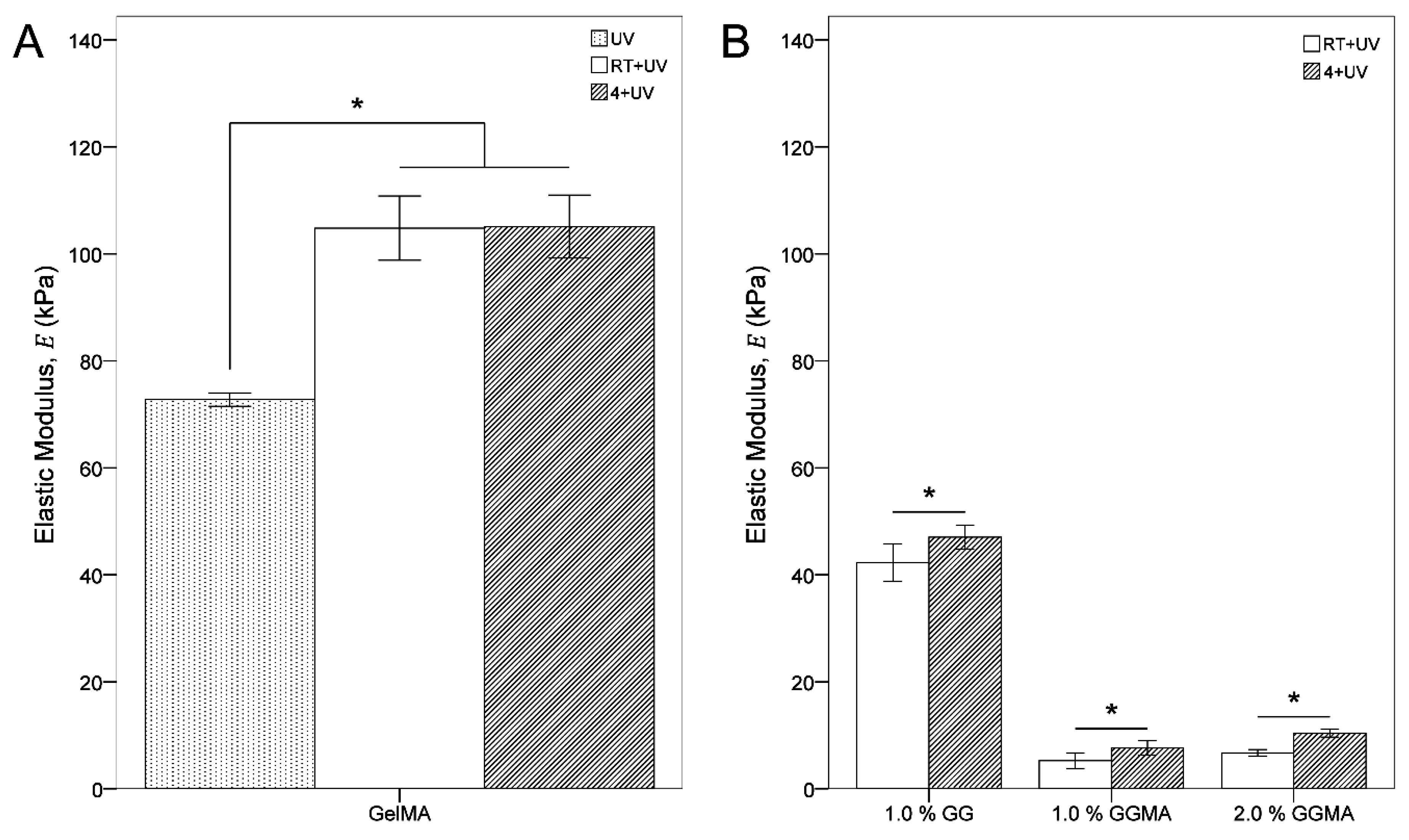 Incubation at RT or 4 °C prior to photopolymerization allows for: the maintenance of cells within the hydrogel matrix at an even distribution without cell settling; a reduction in the influence of physical gelation (which occurs at any time at RT) on mechanical properties between groups; and an increase in base mechanical properties due to the formation of more coherent tertiary structures (through these physical crosslinks). A comparison of the elastic modulus of GelMA crosslinked immediately (UV)