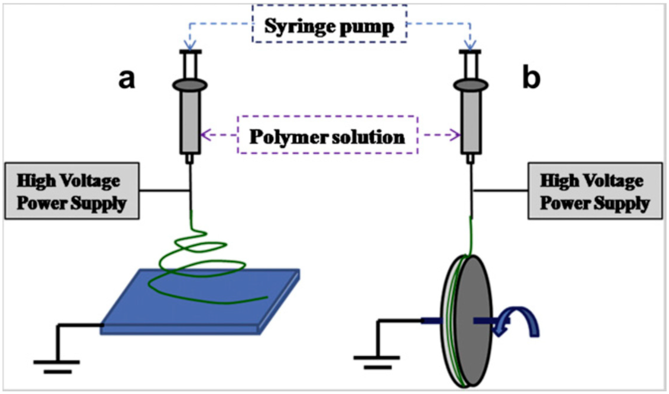Electrospinning setup with (a) flat stationary collector; (b) rotating disc collector. Reprinted with permission from [28], Copyright© 2011 Elsevier.