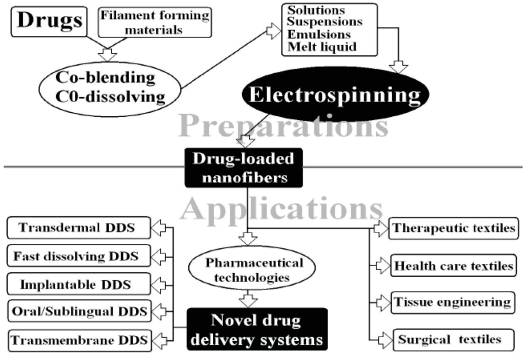 Electrospun nanofibers show great promise for developing many types of novel drug delivery systems (DDS), as shown in Figure 2, due to their special characteristics and the simple but useful and effective top-down fabricating process, DDS is focused on drug-loaded nanofiber preparation from pharmaceutical and biodegradable polymers. All types of active pharmaceutical ingredients have been used as model drugs, such as small molecular drug, herbs, proteins, poorly water-soluble and water-soluble drugs, DNA, genes and vaccines [].