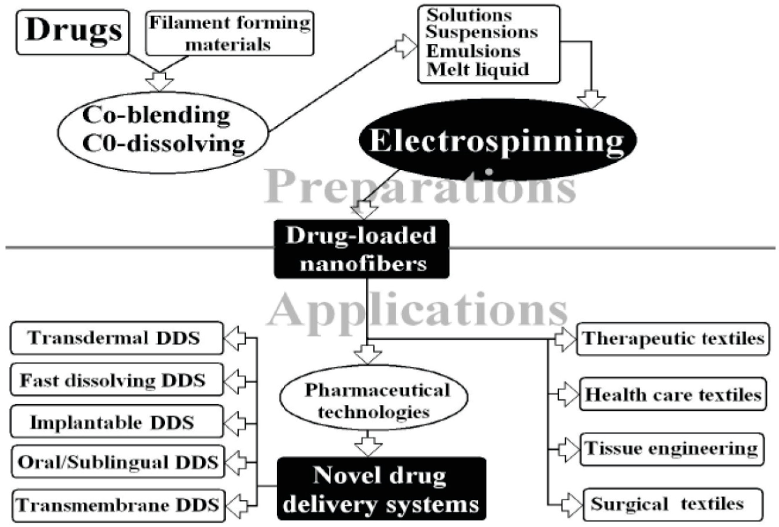 Electrospun nanofibers show great promise for developing many types of novel drug delivery systems (DDS), as shown in Figure 2, due to their special characteristics and the simple but useful and effective top-down fabricating process, DDS is focused on drug-loaded nanofiber preparation from pharmaceutical and biodegradable polymers. All types of active pharmaceutical ingredients have been used as model drugs, such as small molecular drug, herbs, proteins, poorly water-soluble and water-soluble drugs, DNA, genes and vaccines [47].