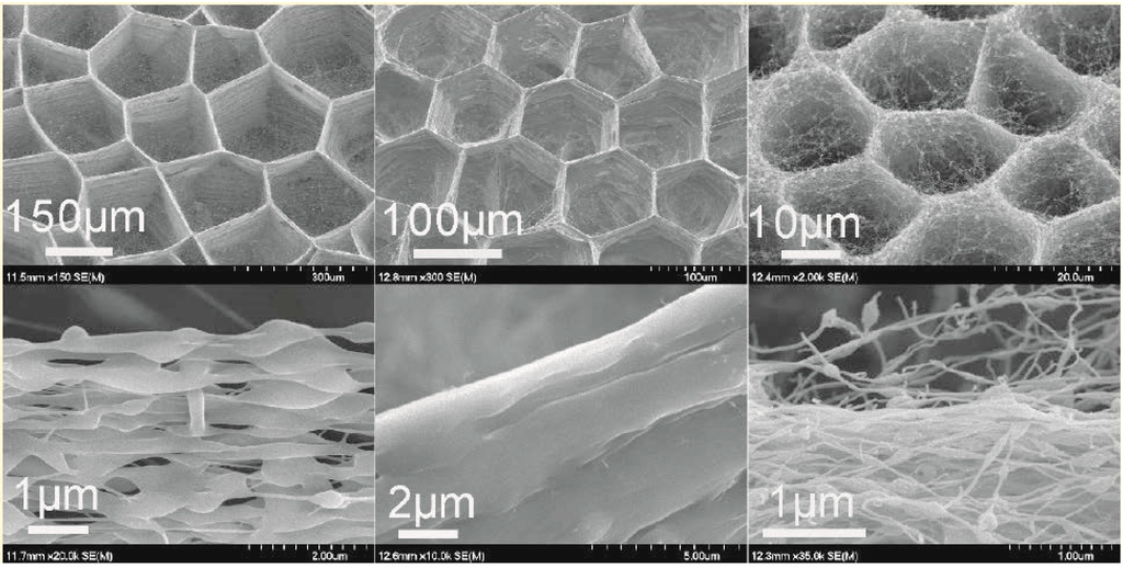 Scanning electron microscope (SEM) images showing honeycomb-like structures of poly(vinyl acetate) (PVA) and poly(ethylene oxide) (PEO). Reprinted with permission from [], Copyright© 2011, American Chemical Society.