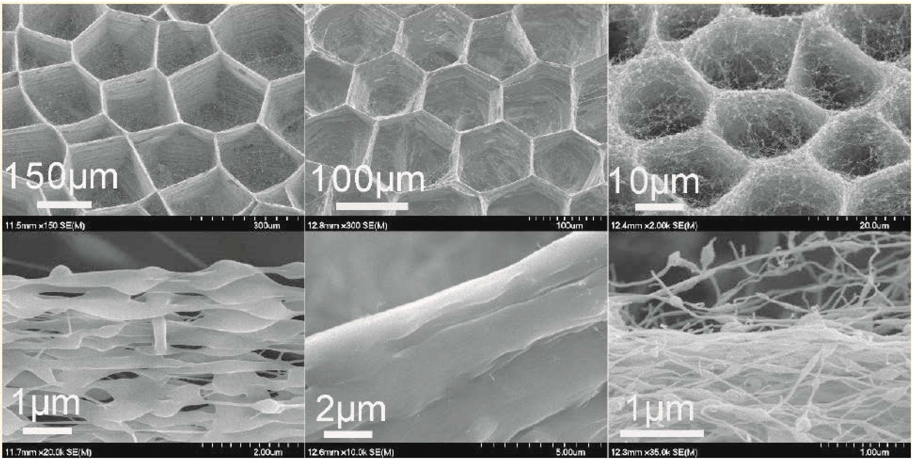 Scanning electron microscope (SEM) images showing honeycomb-like structures of poly(vinyl acetate) (PVA) and poly(ethylene oxide) (PEO). Reprinted with permission from [30], Copyright© 2011, American Chemical Society.