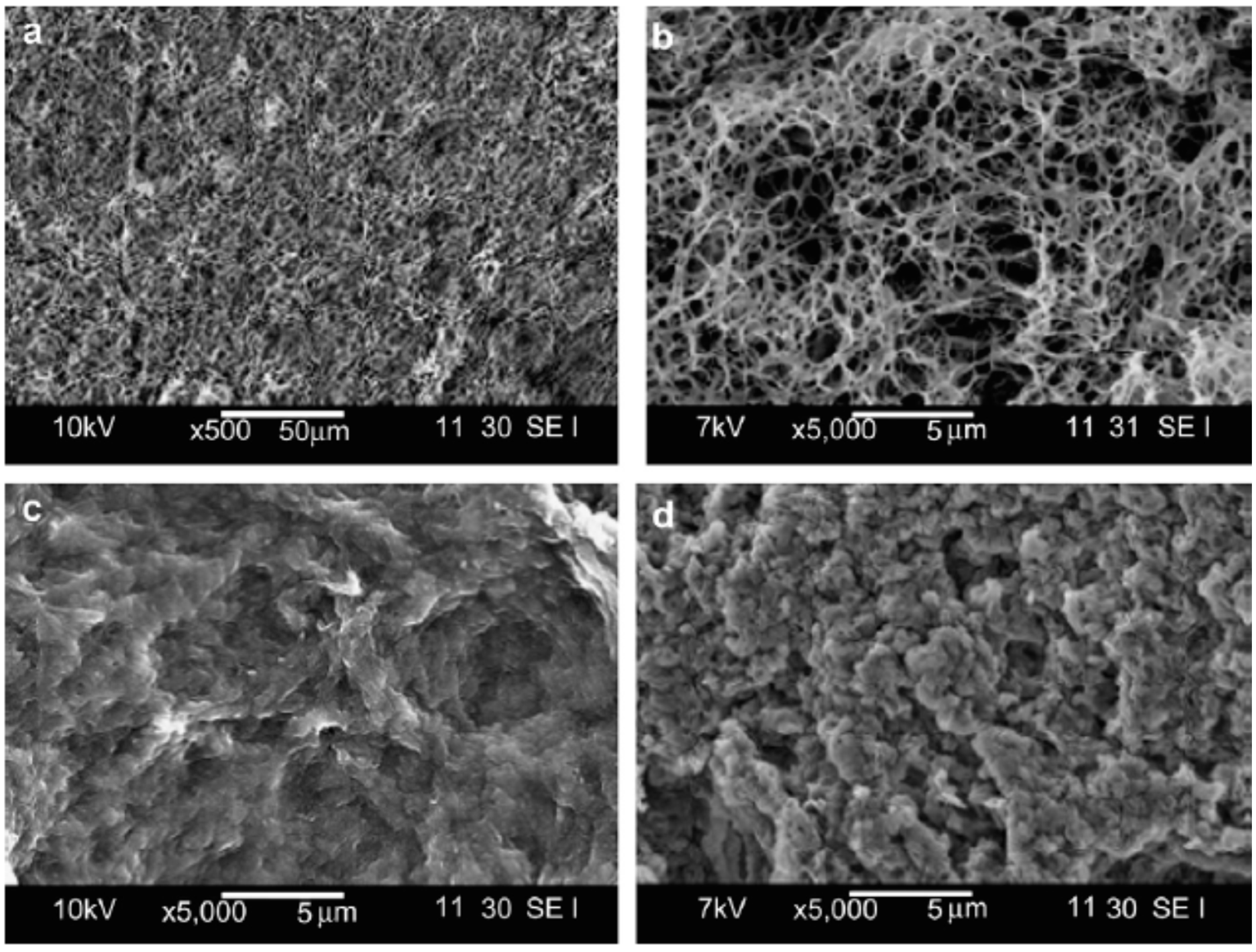 As to the phase separation technique, the nanofibers are formed due to the instability of the polymer within the solvent. They form two different phases because of the physical incompatibility. The general steps involved in phase separation are polymer dissolution, gelation, solvent extraction, freezing and freeze drying. Lei et al. [54] focused on a thermally induced phase separation (TIPS) for the preparation of nanofibrous gelatin-silica hybrids as tissue scaffolds. In their reported method, the freshly prepared silica sol was mixed thoroughly with gelatin solution, then the mixture was cast into a polyethylene mold and immersed in an ethanol bath at −70 °C for 4 h. The hybrid underwent a series of freezing, solvent exchange, freeze and drying processes to get the final foam like structure [31]. Li and co-workers studied nanofibrous polyhydroxyalkanoates (PHAs) matrices for cell growth support, using PHA blends polyhydroxybutyrate (PHB)/poly(3-hydroxybutyrate-co-3-hydroxyhexanoate) (PHBHHx) containing polyhydroxybutyrate (PHB) and copolyesters PHBHHx consisting of 3-hydroxybutyrate and 3-hydroxyhexanoate. The PHA hybrid nanofibers were formed through phase separation due to the solubility preference of the polymer in different solvents. Figure 4 demonstrates that PHB nanofibers only formed when dioxane (Figure 4a,b) was added to the PHB/chloroform solution, while addition of tetrahydrofuran (THF) (Figure 4c) and dimethylformamide (DMF) (Figure 4d) did not result in the nanofiber topography [32].