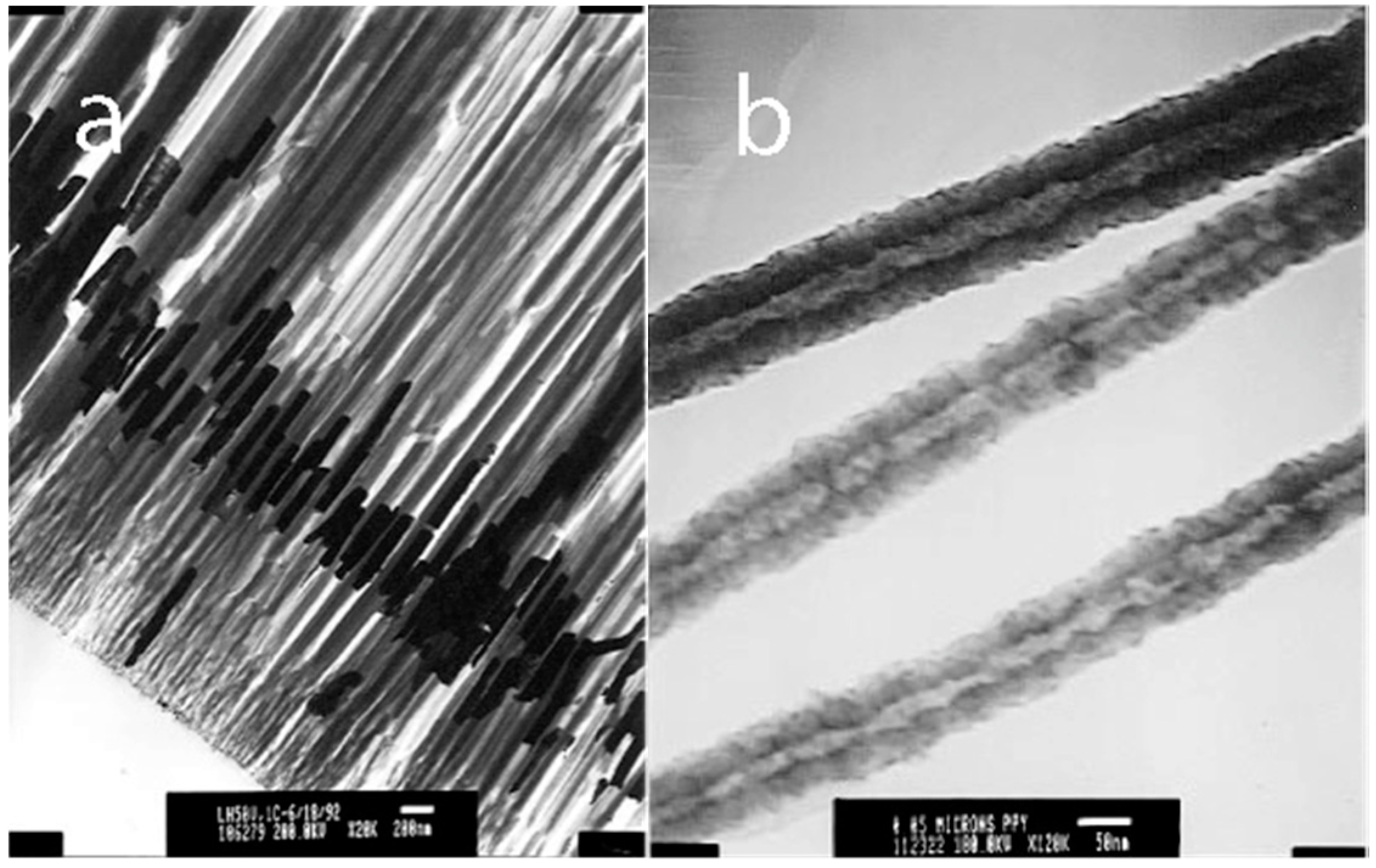 (a) Transmission electron micrograph (TEM) of a microtomed section of an alumina template membrane showing 70 nm diameter Au nanofibrils within the pores; (b) Transmission electron micrograph of three polypyrrole nanotubules. The outside diameter is ~90 nm; the inside diameter is ~20–30 nm. Adapted with permission from [61], Copyright© 1996 American Chemical Society.