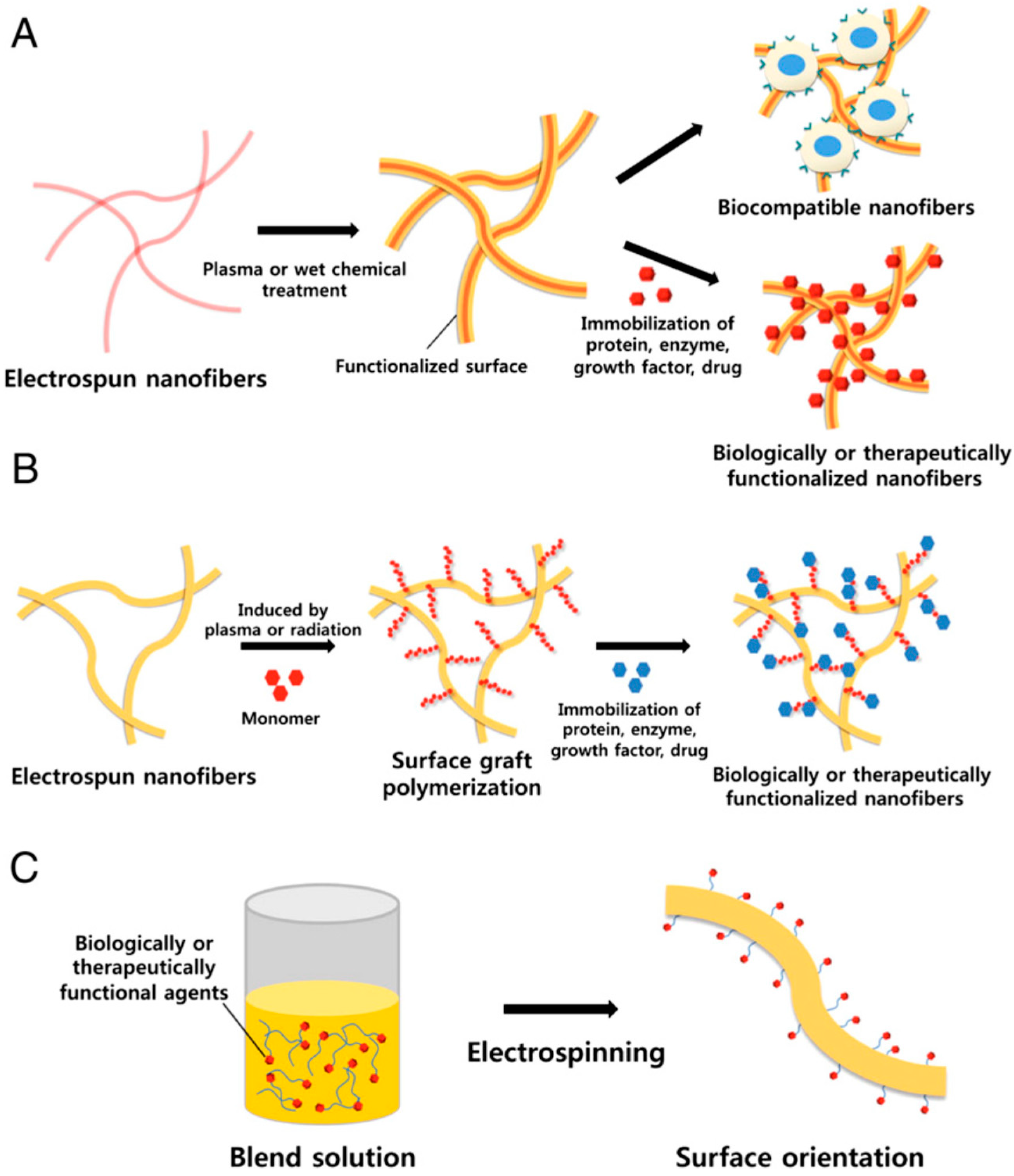 Different modification techniques using (A) plasma treatment (B) surface graft polymerization (C) Co-electrospinning. Reprinted with permission from [72]. Copyright© 2009 Elsevier B.V.