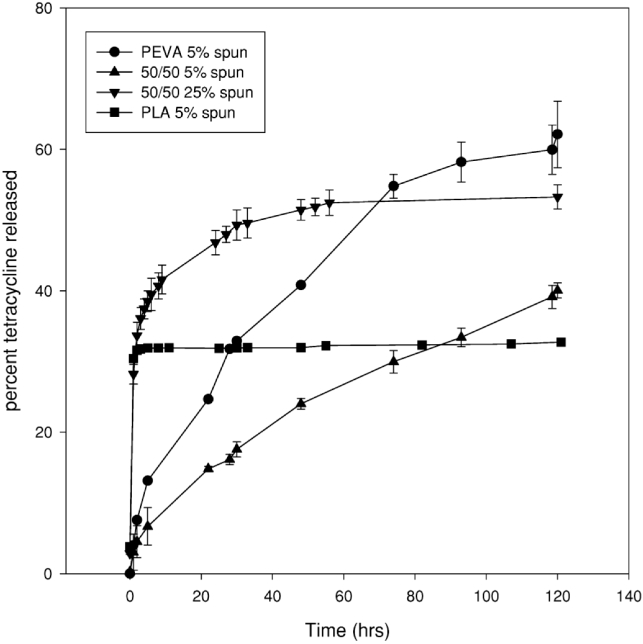 Poly(bis(p-methylphenoxy)phosphazene) (PNmPh) has a chemically stable phosphorus-nitrogen backbone, and thus a great potential to add functionalities onto the backbone to make a family of this type of compounds. The electrospun PNmPh nanofibers can serve as cell growth matrices and the hydrolytically stable property of the nanofibers make it a good candidate to be used as a novel drug delivery system, wound dressing, and as prosthetic devices [33]. Tetracycline hydrochloride, an antibiotic drug against bacterial infections such as periodontal diseases, was investigated on its nanofiber-facilitated delivery. Kenawy et al. [17] prepared poly(ethylene-co-vinylacetate), PEVA, poly(lactic acid), PLA, and their 50:50 blend nanofibers via electrospinning. Their results, shown in Figure 8, indicate that the release of tetracycline hydrochloride can be controlled by controlling the ratio of PLA and PEVA in the blend. It was seen that pure PEVA fibers and 50/50 PEVA/PLA fibers showed prolonged release of tetracycline drug over a period of 120 h as seen in the Figure 8.