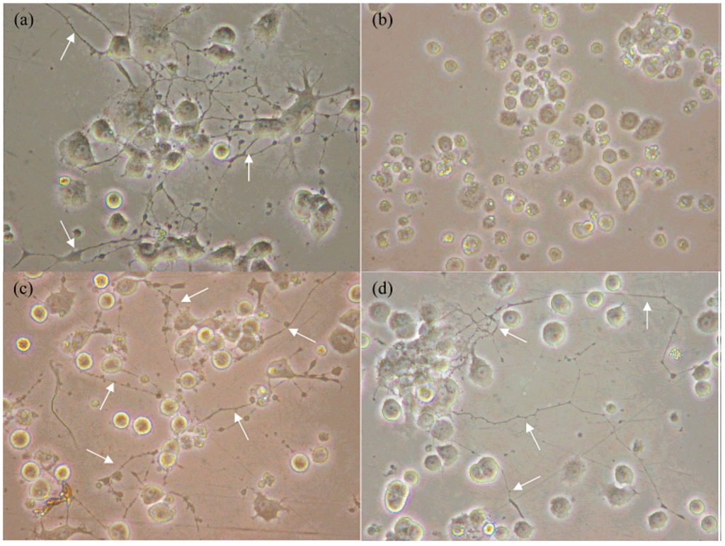 Chew et al. [] investigated the feasibility of encapsulating human β-nerve growth factor (NGF) which is a small secreted protein that is important for the growth, maintenance and survival of certain target neurons. The NGF was stabilized in the carrier protein, bovine serum albumin (BSA) within a copolymer of ε-caprolactone and ethyl ethylene phosphate (PCLEEP). The protein was found to be randomly dispersed throughout the electrospun fibers mesh. After analysis with pheochromocytoma 12 (PC12) neurite outgrowth assay it was confirmed that the bioactivity of electrospun NGF was retained at least throughout the sustained release (shown in Figure 9), which clearly demonstrates that the feasibility of encapsulating protein via electrospinning can be used to produce biofunctional tissue scaffolds.