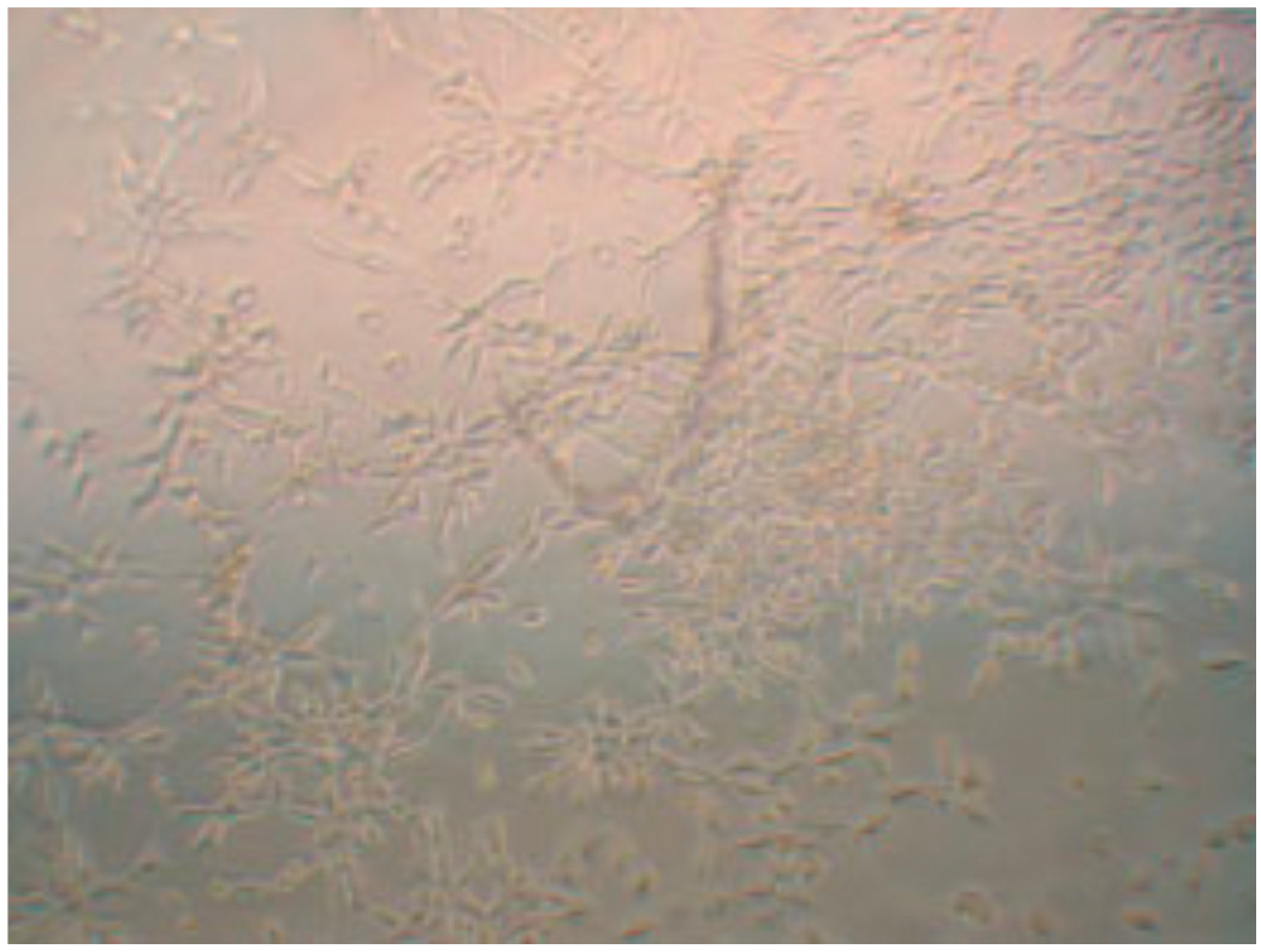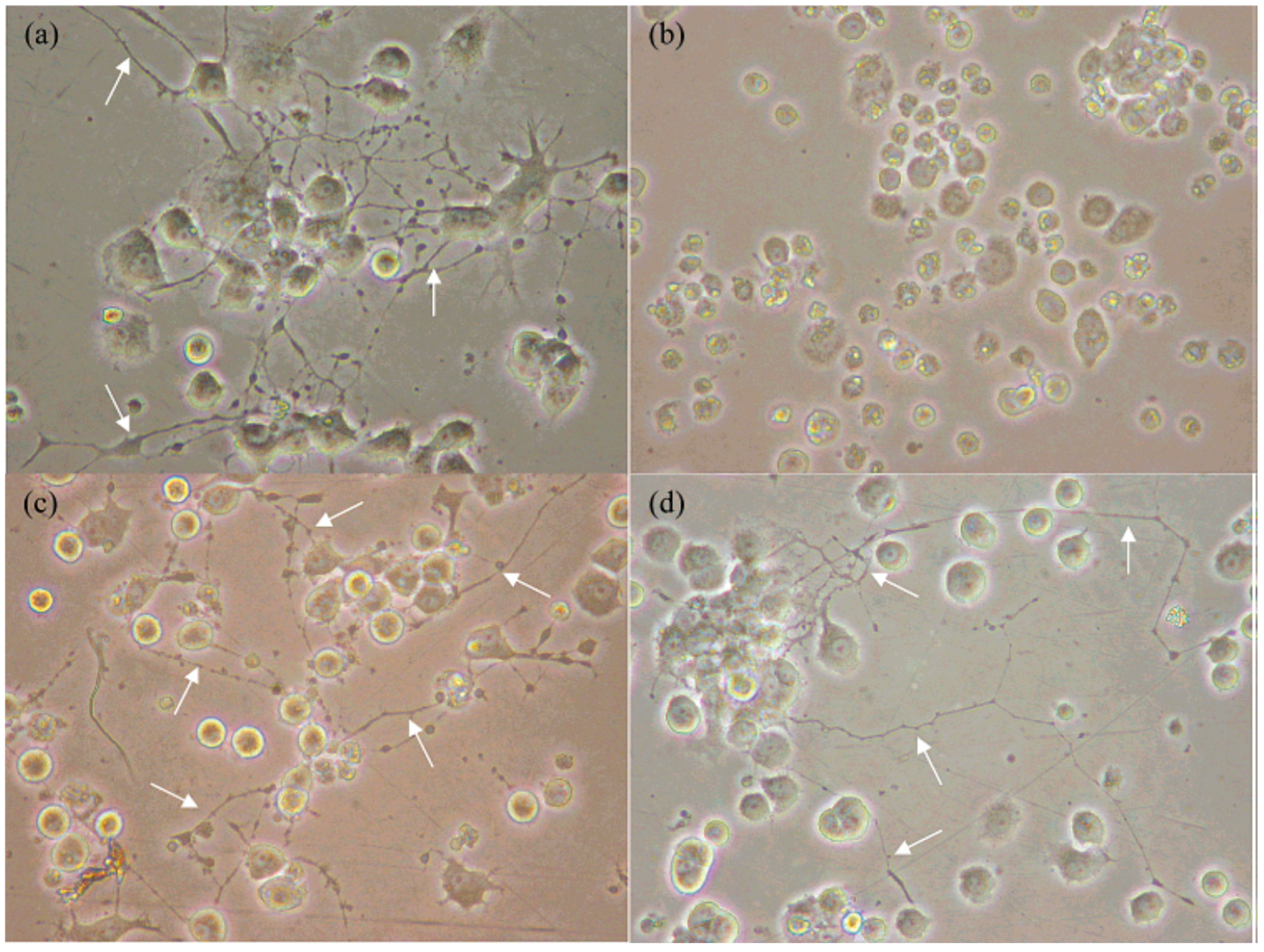 Chew et al. [19] investigated the feasibility of encapsulating human β-nerve growth factor (NGF) which is a small secreted protein that is important for the growth, maintenance and survival of certain target neurons. The NGF was stabilized in the carrier protein, bovine serum albumin (BSA) within a copolymer of ε-caprolactone and ethyl ethylene phosphate (PCLEEP). The protein was found to be randomly dispersed throughout the electrospun fibers mesh. After analysis with pheochromocytoma 12 (PC12) neurite outgrowth assay it was confirmed that the bioactivity of electrospun NGF was retained at least throughout the sustained release (shown in Figure 9), which clearly demonstrates that the feasibility of encapsulating protein via electrospinning can be used to produce biofunctional tissue scaffolds.