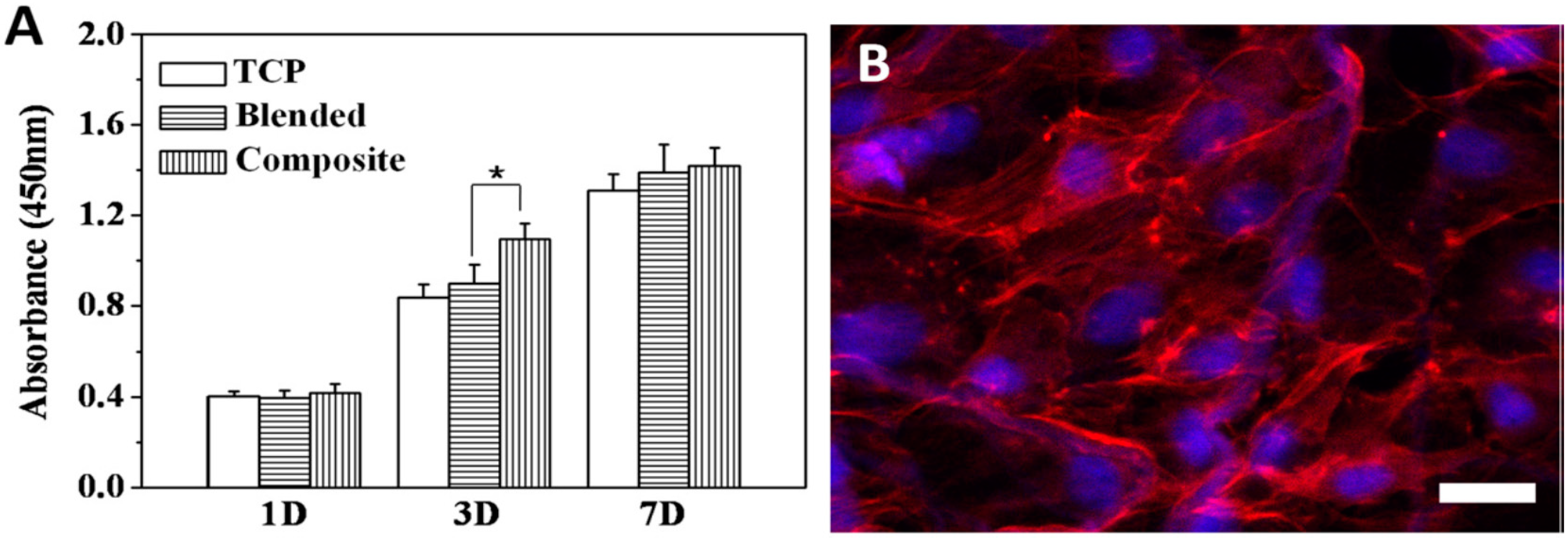 Huang et al. prepared three layered nanofibers made of collagen, chitosan and poly(l-Lactide-co-caprolactone) (P(LLA-CL)). The inner and outer layers were made of chitosan and collagen blends whereas the middle layer was P(LLA-CL). They used rat endothelial cells as seeding material in scaffolds and checked for its proliferation rate at different time intervals. On day 3, it was seen that there was a dramatic increase in the proliferation value. This could be due to the presence of collagen and chitosan on the interior and exterior layers which provide bioactive sites for the endothelial cells to attach and proliferate. However, on day 7, proliferation remained constant with the other counter parts (Figure 11), i.e., blends and TCP. The limited proliferation rate on day 7 could be due to overcrowding of the cells and space issues [124].