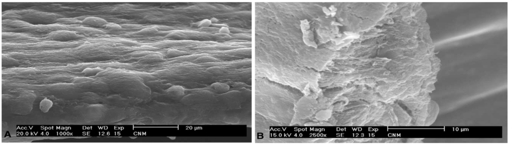 Several synthetic polymers are being used to prepare scaffolds like PLA [] poly(ethylene terephthalate) (PET) [] for blood vessel tissue engineering. Copolymeric materials are also used for this purpose such as poly(l-lactide-co-caprolactone) (PLLA-CL) for smooth muscles and endothelial cells []. Synthetic polymers are easy to prepare and give reproducible results which are not seen in the case of natural polymers. They are durable and have good mechanical strength. However, the biocompatibility of synthetic fibers is low. Conductive polymers like polyaniline and polypyrrole are of interest for biological tissues, because new technologies require tissue scaffolds that not only physically support tissue growth, but also are electrically conductive. Thus the tissue scaffolds are capable to stimulate specific cell functions or trigger cell responses [,]. Recently, Gizdavic-Nikolaidis et al. [,] reported that electrospun functionalized polyaniline/poly(lactic Acid) nanofibers allow mammalian cells to attach and proliferate, while killing pathogenic bacteria cells, and are novel conductive materials that are potentially well suited for use as biocompatible scaffolds for tissue engineering and as antimicrobial wound dressings that have the advantage of being able to kill microorganisms without use of an antiseptic.