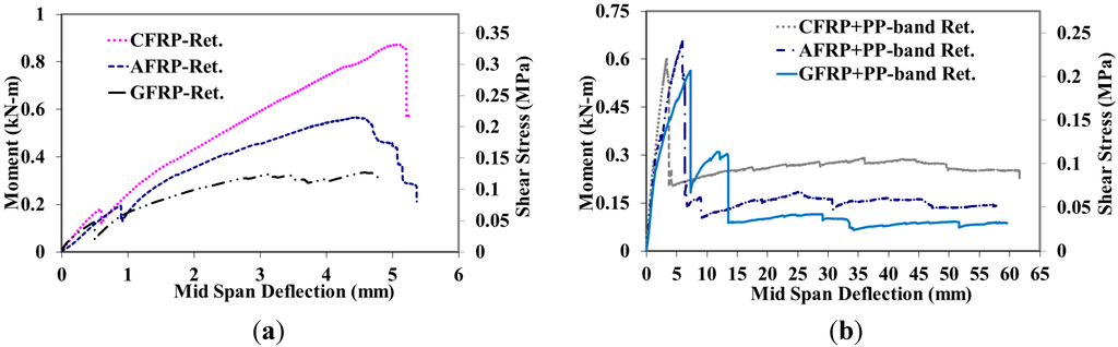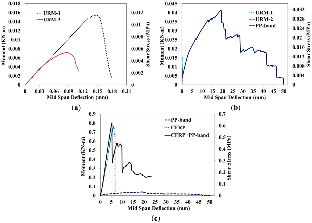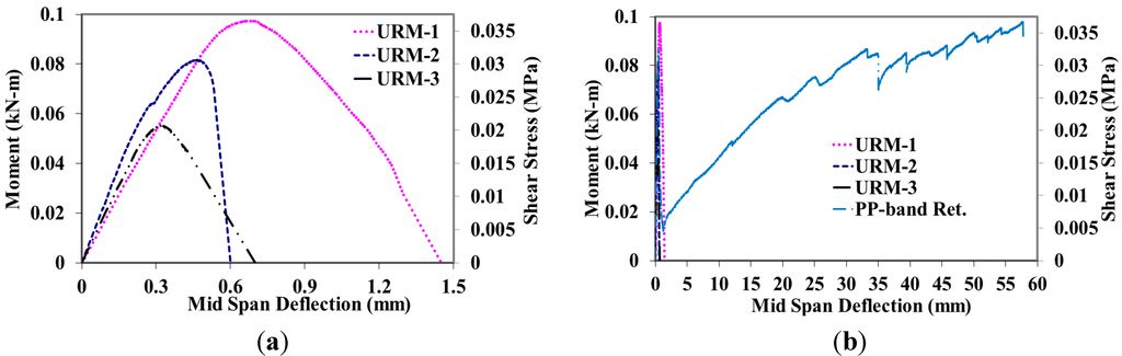 Figure 4a,b show the moment-deflection curves of three URM and PP-band retrofitted masonry panels, whereas corresponding shear stress is plotted on the secondary vertical axis. URM panels have shown a variety of peak strengths with an average value of 0.08 kN-m with almost similar initial stiffness. Behavior of panels was almost linear up to the peak load, as shown in Figure 4a. Figure 4b shows the moment-deflection curve of PP-band retrofitted masonry panel. It has shown peak strength of 0.085 kN-m, which is almost the same as that of URM masonry panels. In the case of PP-band retrofitted masonry panel after the deflection of 1.2 mm, it again started taking load and has gone up to a value of 57.7 mm with a moment value of 0.097 kN-m, as shown in Figure 4b. PP-band retrofitted masonry panel has shown a fairly long deflection and deformation as compared to URM masonry panels.