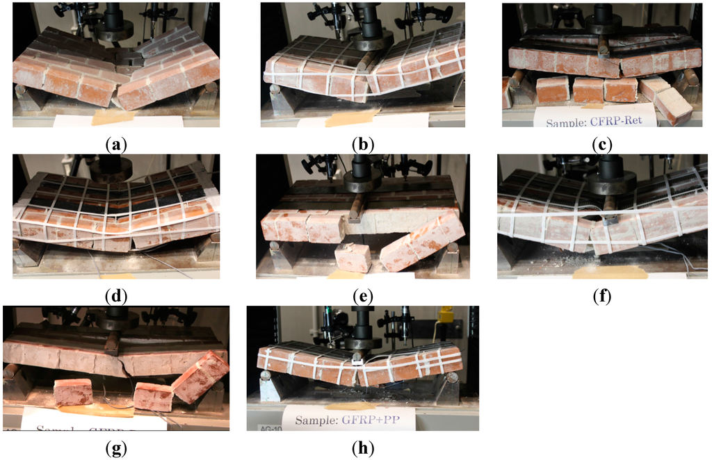 Figure 6 shows that failure pattern of different type of masonry panels under out-of-plane bending test. Figure 6a shows a pure bending type of failure with major bending cracks and spalling of bricks from the central part of the panels. There were no signs of shear failure near supports. Figure 6b shows that PP-band retrofitted masonry panel failure. Failure of PP-band retrofitted masonry panels was the same as that of URM masonry panels but the presence of PP-band kept the brick masonry as a single unit. PP-band has not provided any increase in bending strength but after the initial drop of strength due to masonry failure, PP-band enabled the panel to take load after the initial failure. Figure 6c,e,g show the failure of CFRP, AFRP and GFRP retrofitted masonry panels. All FRP retrofitted masonry panels have shown a stepwise failure initiated with the fall of inner and outer bricklayers. Brittle failure of panels was mainly due to detachment and debonding of FRP from brick surface. No FRP rupture was witnessed in any of CFRP, AFRP and GFRP retrofitted masonry panel, failure was due to delamination of FRP from the panel surface. Failure patterns of CFRP + PP-band, AFRP + PP-band and GFRP + PP-band retrofitted masonry panels are shown in Figure 6d,f,h, respectively. Initial failure of all three FRP + PP-band retrofitted masonry panels was similar as that of only FRP retrofitted masonry panels but presence of PP-band did not allow the masonry panel to dismember and kept it as one unit which enabled it to undergo further displacements.