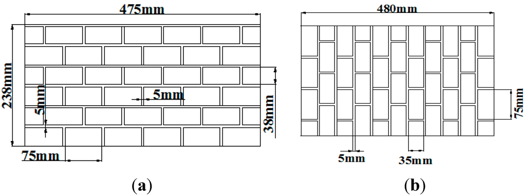 In most of developing countries, length of brick ranges from 200 to 300 mm, whereas thickness of mortar ranges from 13 to 20 mm. Keeping in mind aforementioned aspects, length of the brick was scaled down to 75 mm for better handling, laying and based upon available manufacturing facilities, whereas depth of brick was kept half of its length. Thickness of brick was kept 50 mm to provide sufficient out-of-plane stability during application of in-plane loads. Thickness of mortar was kept 5 mm to control the consistency of the wall panels and to allow the failure, either inside the mortar or at brick mortar interface.