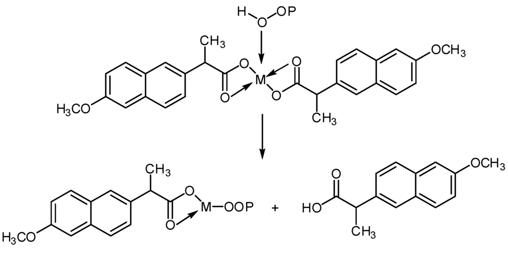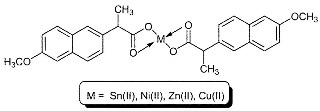 - Ahmed, A.; Shneine, J.; Yousif, E.; Salman, H. Synthesis and characterization on some metal ions of 2-(6-methoxynaphthalen-2-yl)propanoate complexes. J. Al-Nahrain Univ. 2013, 16, 46–50. [Google Scholar]