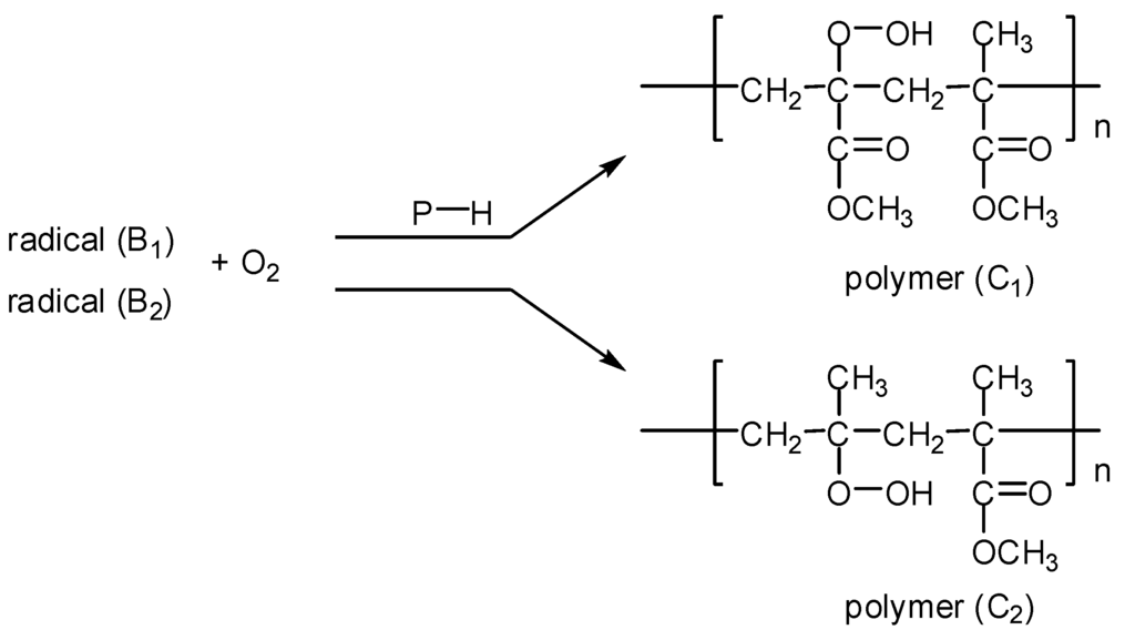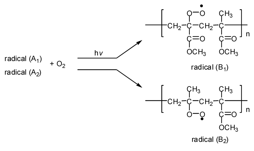 (2) The formation of peroxy radicals B1 and B2 via reaction of A1 and A2 free radicals with oxygen, respectively (Figure 3).