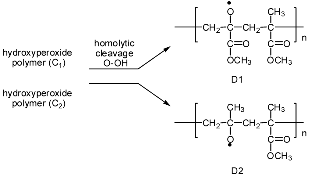(4) The homolytic cleavage of the O−OH bonds of the hydroperoxy polymers C1 and C2 to produce the polymer oxy radicals D1 and D2, respectively (Figure 5).
