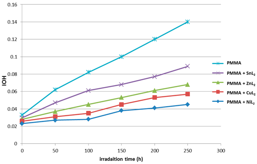 2-(6-Methoxynaphthalen-2-yl)propanoate complexes were used as additives for the PMMA films’ photostabilization. The hydroxyl group index was monitored with irradiation time using IR spectrophotometry to allow the photochemical activity of these additives for the photostabilization of PMMA films to be studied. The PMMA films was irritated with a UV light (λ = 313 nm) and produced a clear change in the FTIR spectrum. The absorption bands appearing at 3430 cm−1 was attributed to the formation of the OH groups [29]. Such an absorption band was used to follow the progress of the degradation of the polymer with irradiation and has been calculated as the hydroxyl index. It is fair to link the polymer degradation degree with the growth of the hydroxyl index. However, in Figure 9, the IOH of SnL2, ZnL2, CuL2 and NiL2 indicated a lower OH growth rate with irradiation time for the PMMA control film in the absence of any additives. Since the growth of the hydroxyl index with irradiation time was lower than the PMMA blank (Figure 9), it was conclude that such additives could be considered as photostabilizers for the PMMA polymer. In principle, a longer induction period is a sign of an efficient photostabilizer. Therefore, the NiL2 is considered to be the most efficient photostabilizer, followed by CuL2, ZnL2 and SnL2.