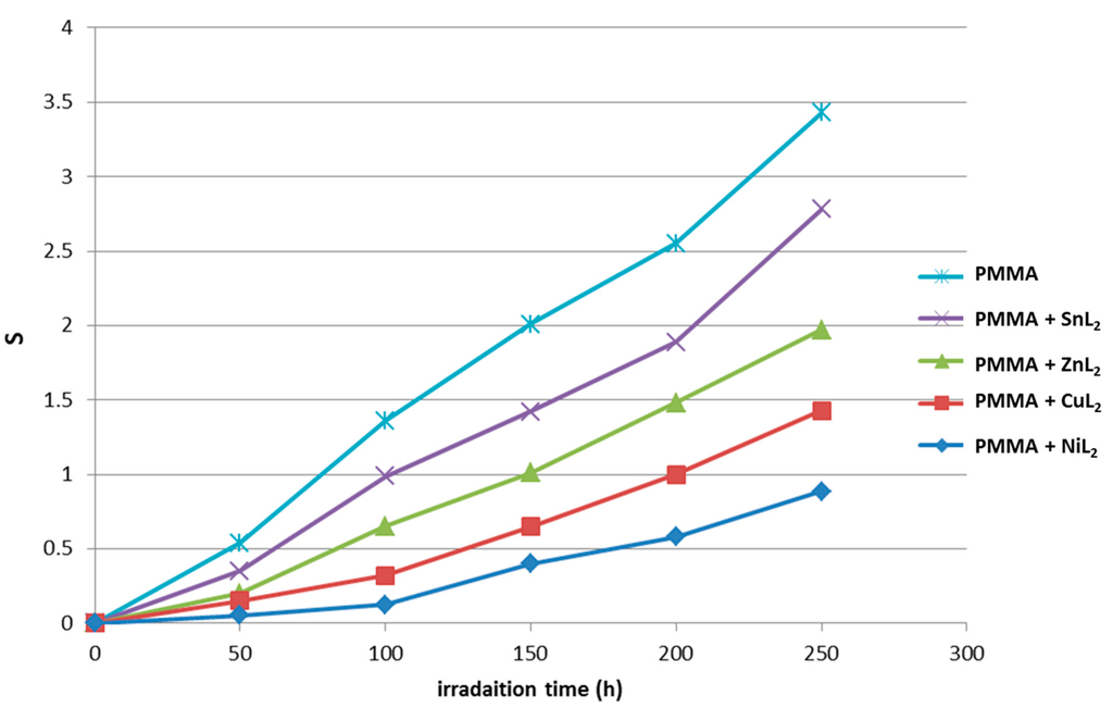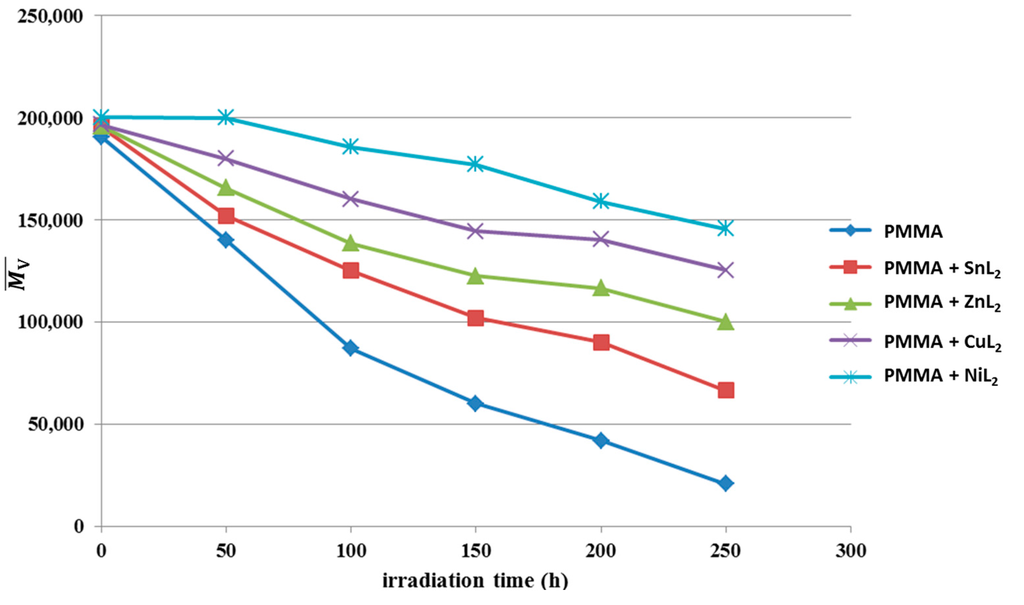 Photostabilization of poly(vinyl chloride) (PVC) films having different concentrations (0.1%–0.5% by weight) of various additive metal complexes has shown that a complex concentration of 0.5% by weight gave the best results [19]. Such a concentration has been applied successfully for photostabilization of PVC and polystyrene films with other additive metal complexes [27,28]. Therefore, additive metal complexes have been used in a concentration of 0.5% by weight.