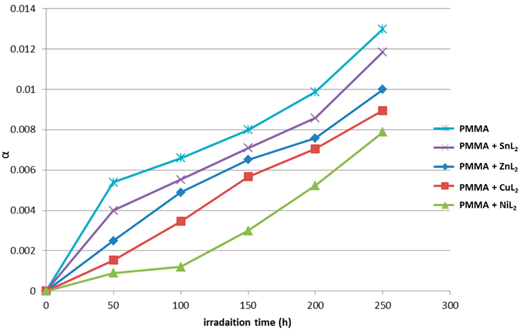 The results obtained showed that the efficiency of bis[2-(6-methoxynaphthalen-2-yl)propanoate] complexes as stabilizers for PMMA films can be ordered according to the change in the hydroxyl content as a reference for comparison (Figure 9), where NiL2 > CuL2 > ZnL2 > SnL2 > PMMA.