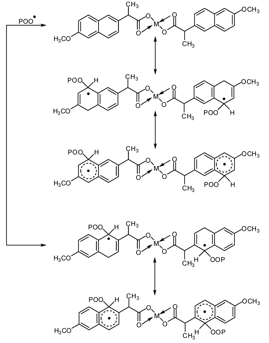 3.3. Suggested Mechanisms of Photostabilization of PMMA by the bis[2-(6-Methoxynaphthalen-2-yl)propanoate] Complexes