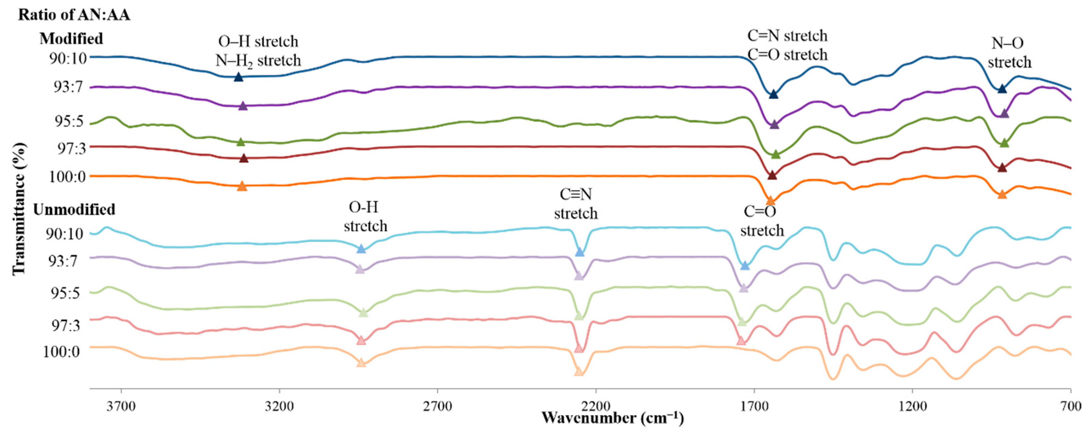 | 2 | 0.5 M of hydroxylamine hydrochloride (HH) was adjusted to pH 6 by sodium bicarbonate. The mixture was heated and stirred at 70 °C and 80 rpm respectively. 0.250 g of poly(AN-co-AA) was added and allowed to react for 1 h. Then, the poly(AN-co-AA) was filtered, washed, and dried at 60 °C. | The HH needed was 1.2 M for 0.20 g polymer [15]. | The HH needed was 0.5 M for 0.25 g polymer. | Less usage of chemical. |