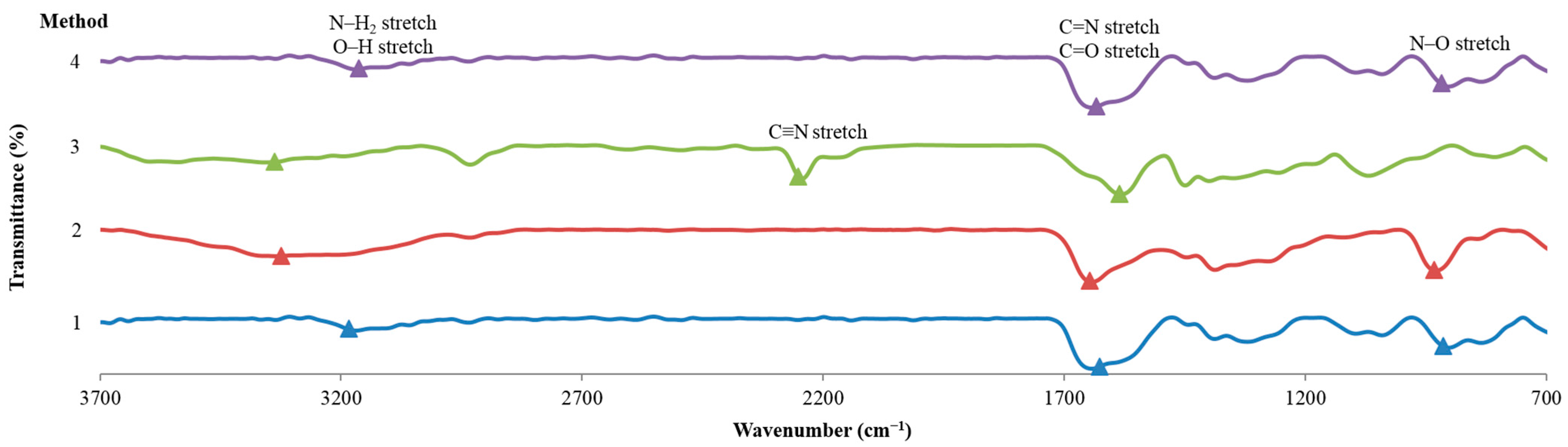 3.4. Fourier Transform Infrared (FTIR) Spectra