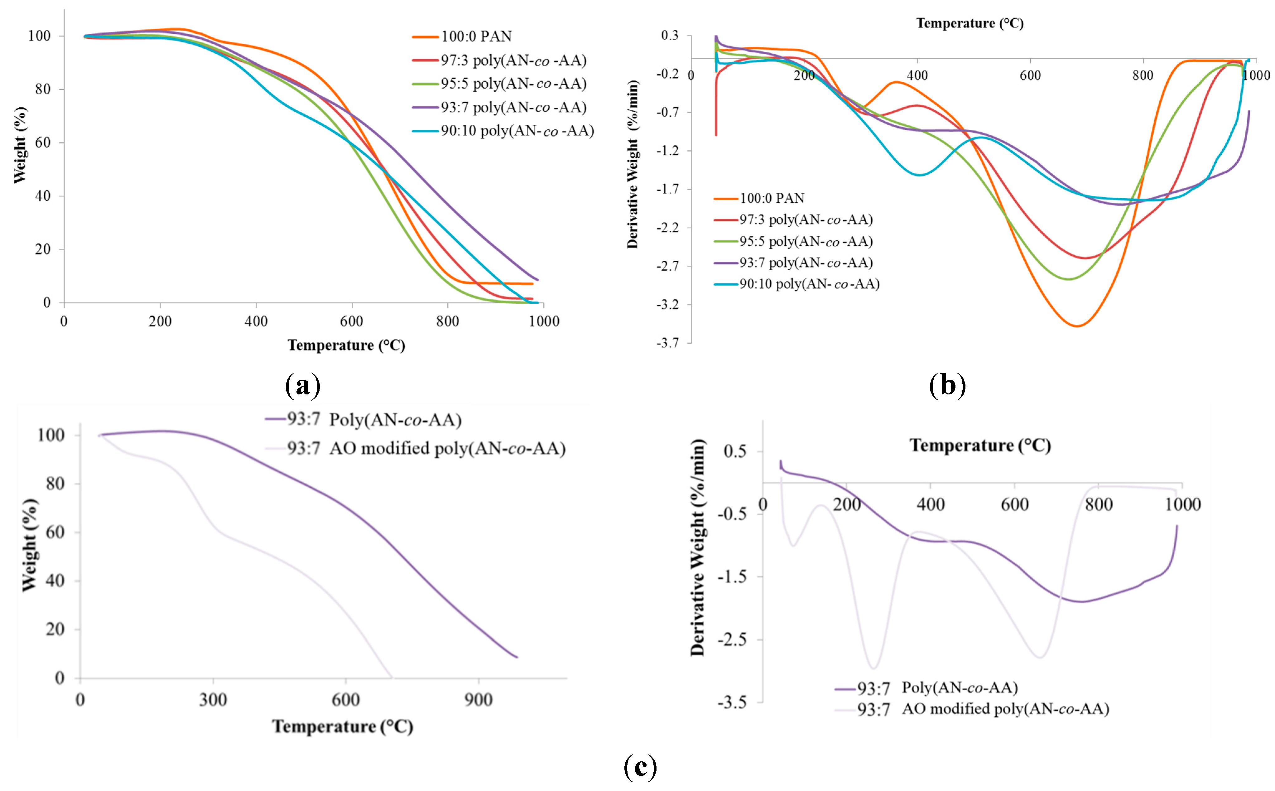 - Jamil, S.N.A.M.; Daik, R.; Ahmad, I. Preparation and thermal behaviour of acrylonitrile (AN)/Ethyl acrylate (EA) copolymer and acrylonitrile (AN)/ethyl acrylate (EA)/fumaronitrile (FN) Terpolymer as precursors for carbon fibre. Pertanika J. Sci. Technol. 2010, 18, 401–409. [Google Scholar]