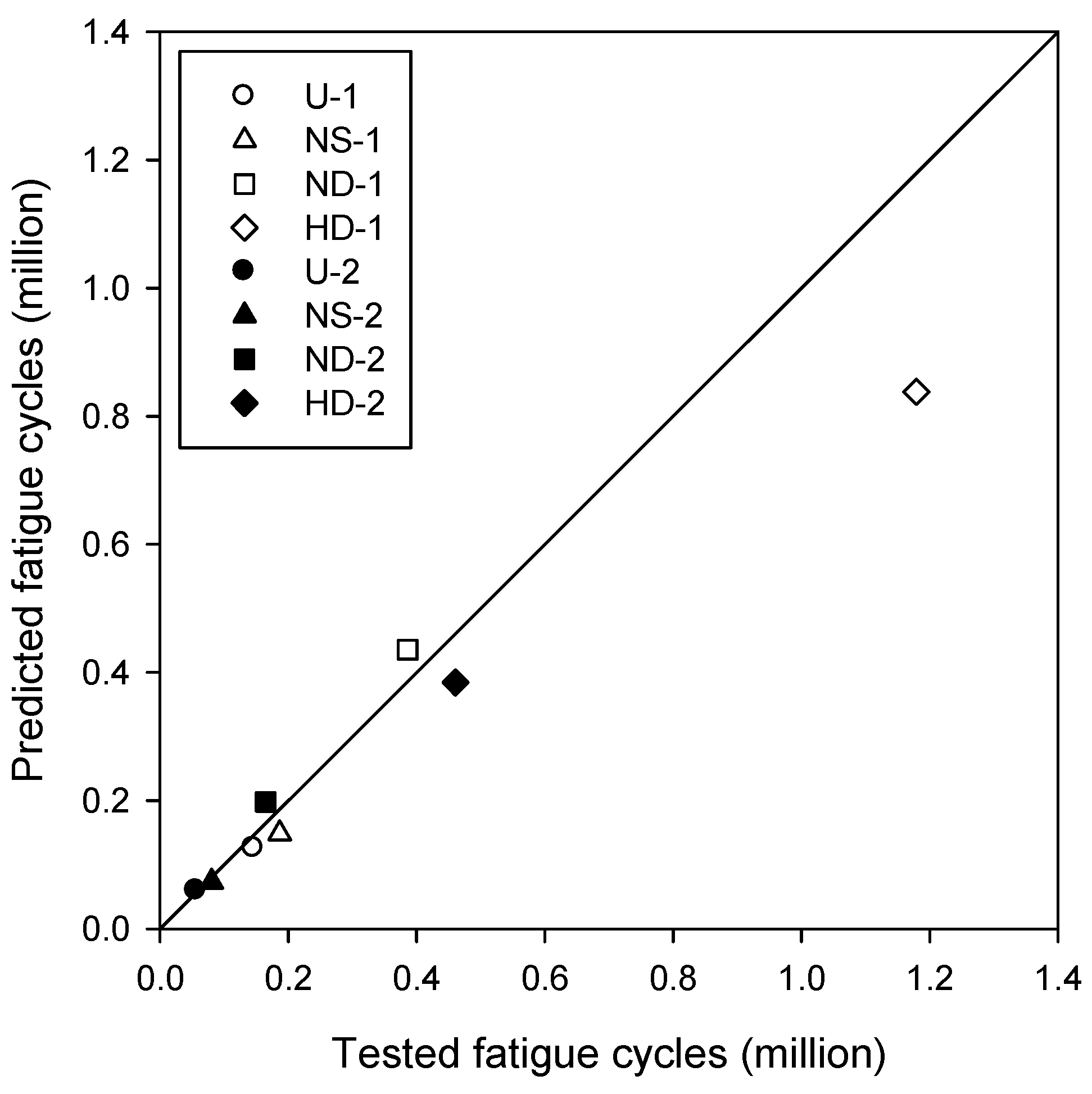 | Specimen | CFRP modulus | Bond configuration | Stress range (MPa) | Bond thickness (mm) | Tested fatigue cycles (N) | Extension ratio | Predicted fatigue cycles (Np) | Np/N |