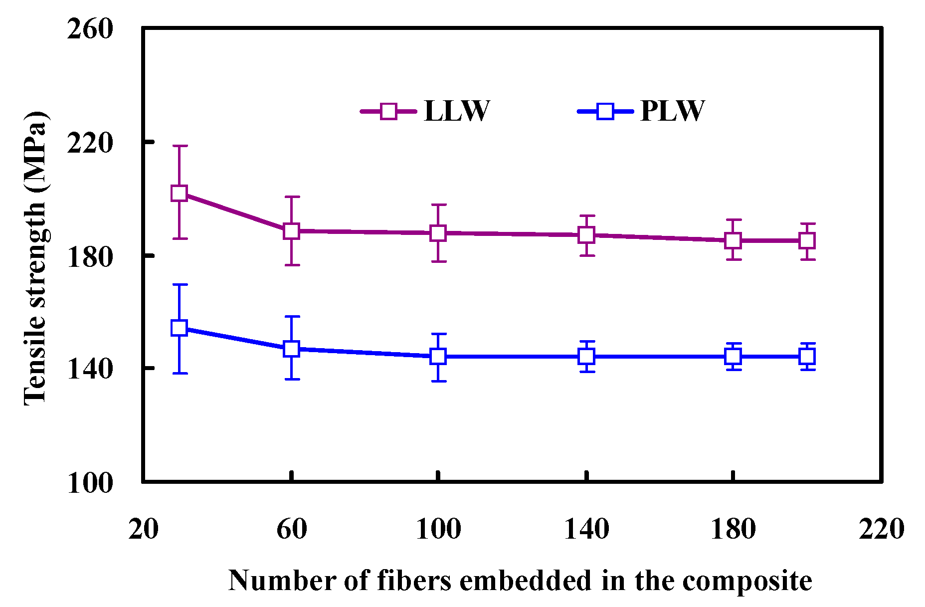 Similarly, there is a size effect on the composite strength, where the average strength decreases with increasing number of fibers. The decreasing trend in tensile strength could be due to weak-link statistics, proving that a material with larger volume can be considered to have a larger number of links than a smaller one and therefore have an increasing probability of encountering a more severe flaw along the material [1]. Meanwhile, the results demonstrate that the dependence of strength on size disappears when the specimen is sufficiently large.