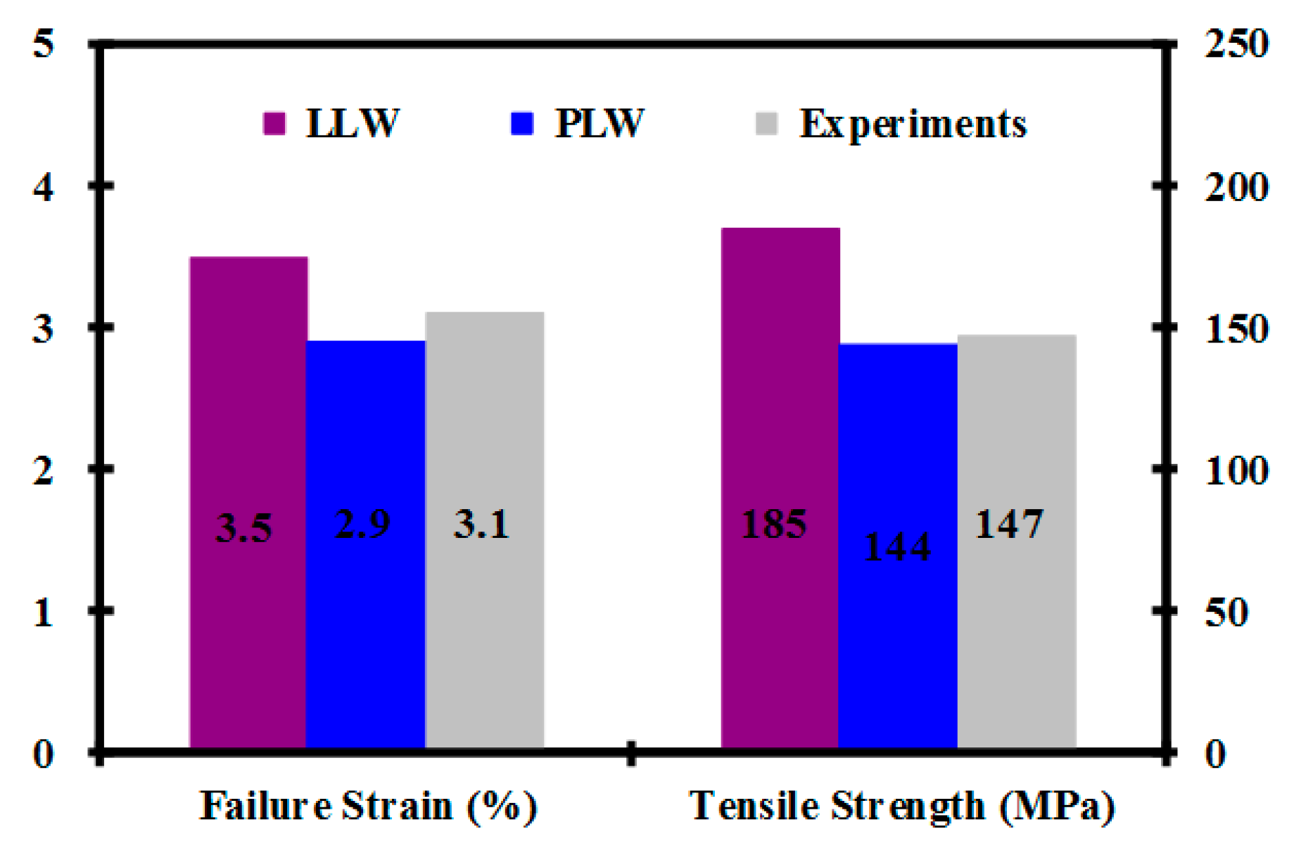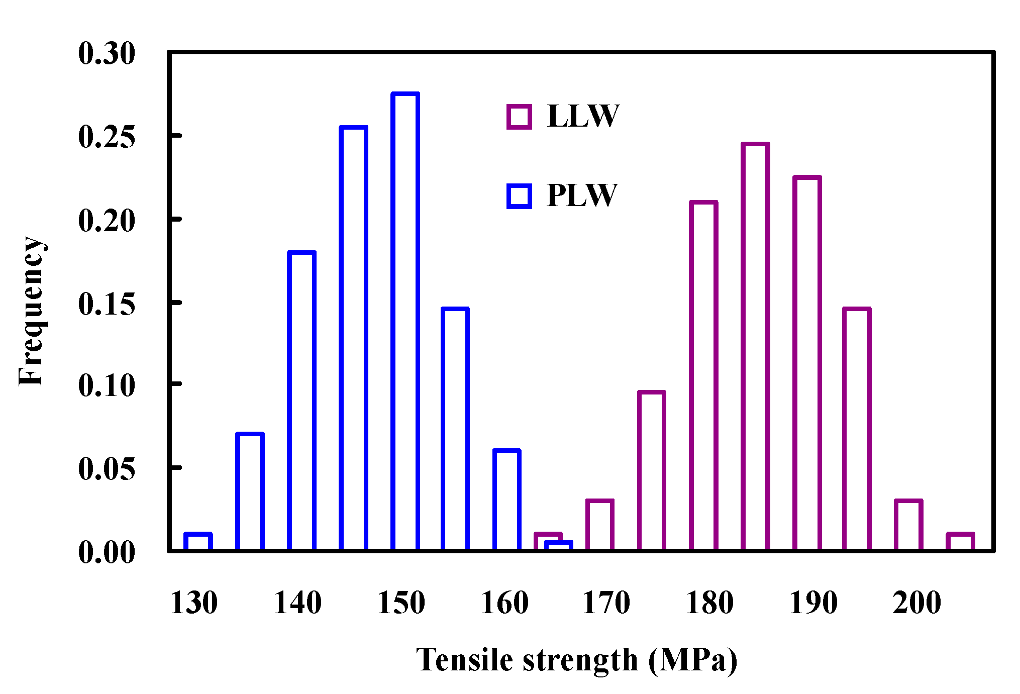 Figure 4 shows the histogram of the tensile strength distribution obtained from our simulation studies. In the case of PLW model, there is a weaker strength in the composite as compared to the LLW model. This is primarily due to the fact that the PLW method allows a larger variability in fiber strength, resulting in lower composite strength. As would be expected, the statistical variation of tensile strength for such composites is still affected by the fiber strength variability [36].