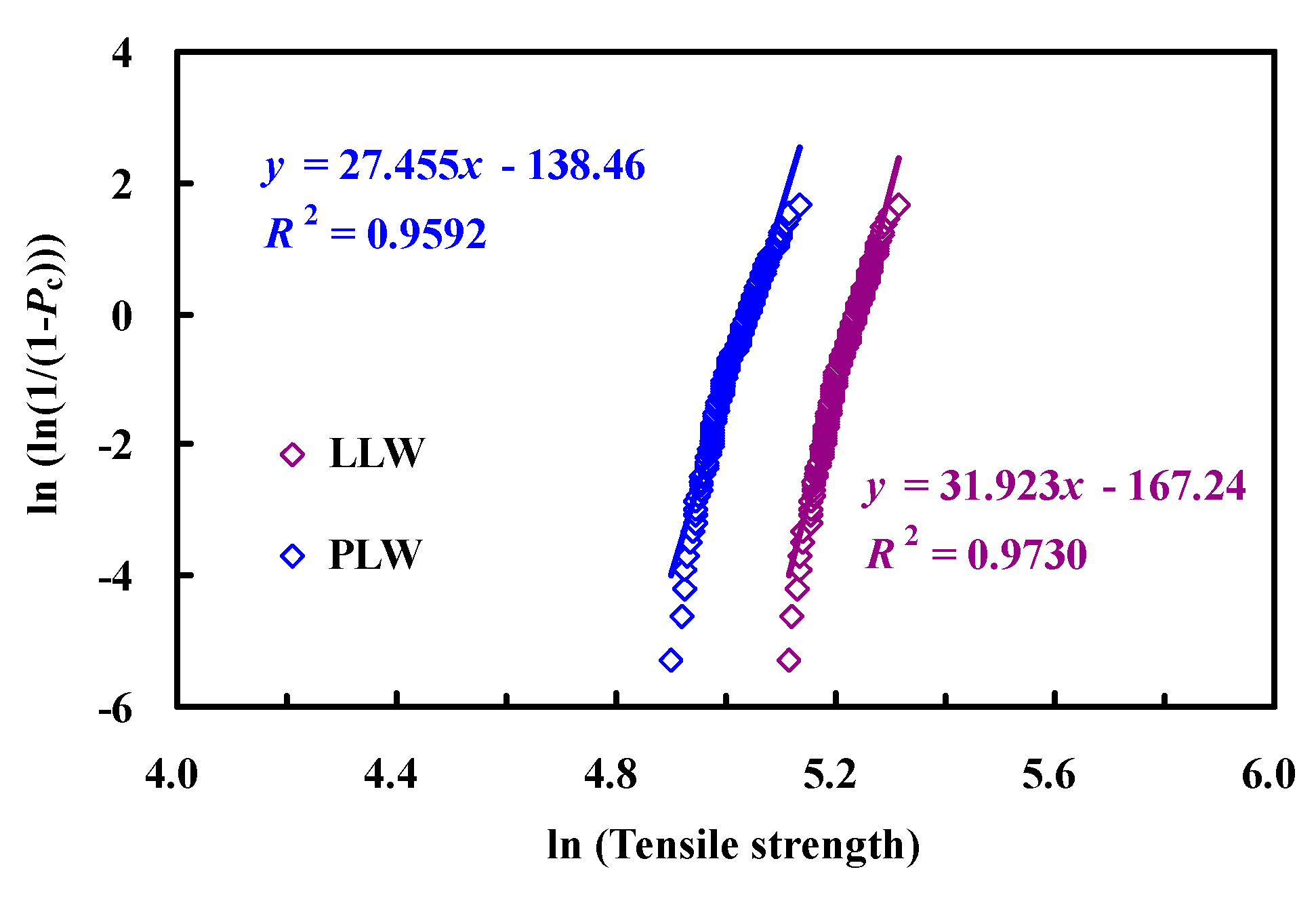 For a constant tested length, rearranging and taking the double natural logarithms of both sides in Equation (1) or (2) can lead to a linear regression model in the form Y = γX + A, where , , and . Hence, the scale and shape parameters can be easily obtained using the least square minimization, which will give a straight line with the gradient γ and the Y-intercept A.
