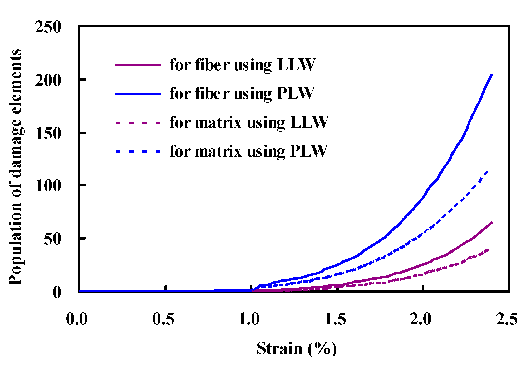 Table 6 presents the predictions of damage initiation and ultimate failure in the composite via the two Weibull distributions. Results of simulations using the PLW model are different from those obtained with the LLW model. Due to the presence of weak fiber elements with lower strength, the fiber damage is more likely to initiate when performing simulations with the PLW model.
