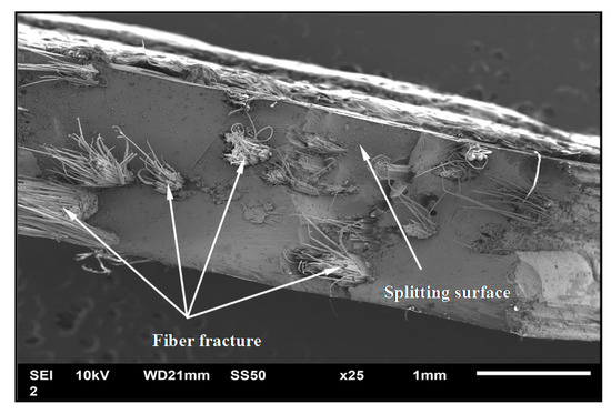 Figure 5 shows the damage–strain curve for fiber and matrix, and the ordinate is represented by the average number of damage elements. There are two findings that should be addressed. One is that the PLW model leads to a higher damage growth rate, as compared with the LLW model. The difference is observed after the beginning of the initial damage in fibers, and becomes more pronounced as more fibers break. This phenomenon can be attributed to the fact that those fibers described by the PLW model exhibit larger strength variability, and thus have a lower average strength. Consequently, the stress concentrations derived from a fiber breakage may more easily cause other fibers or matrix near the failure site to fail. The second finding is that evidence of larger fiber fracture and less matrix cracking has been achieved through the simulations. Furthermore, the scanning electron micrograph that shows the fracture surface morphology of composite specimen is presented in Figure 6. It is concluded from these results that fiber fracture is prominent in the microfailure mechanism associated with the tensile behavior of such composites.