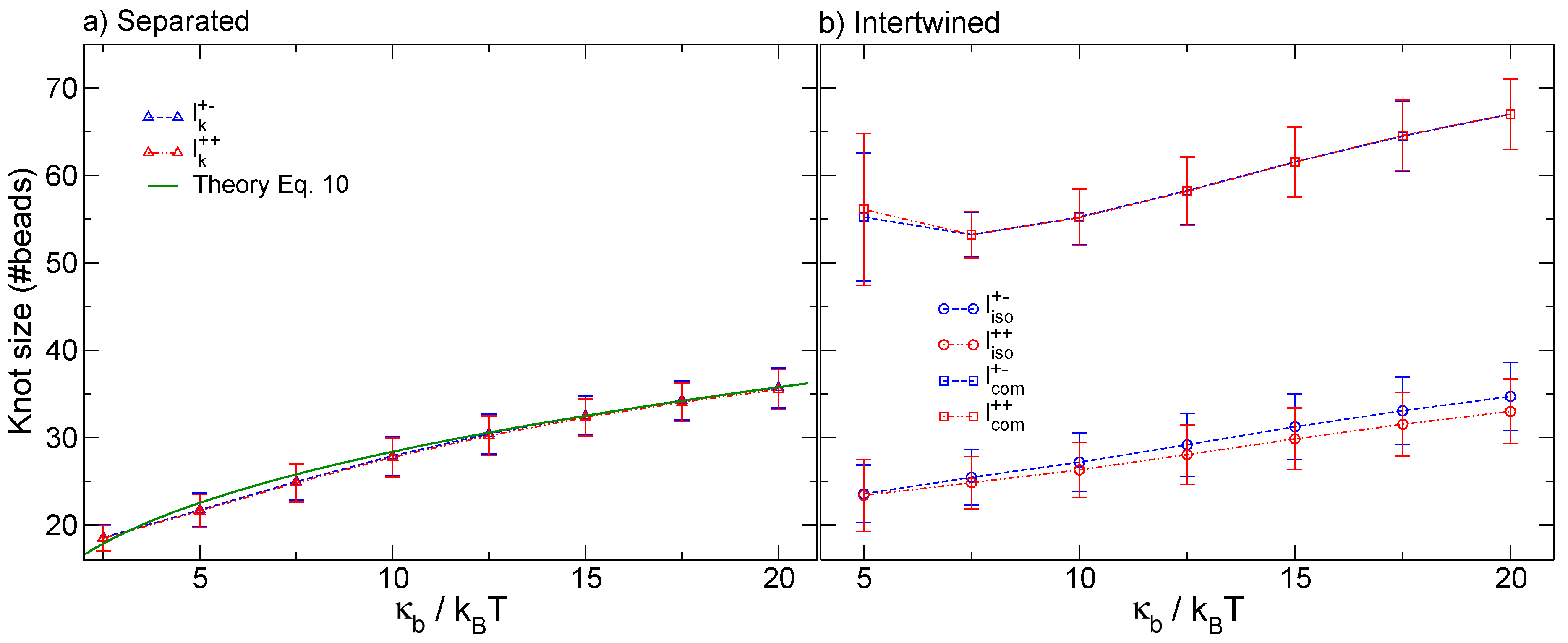 - Finally, as the knots become intertwined at yet smaller effective separations, the absolute magnitude of the free energy—And consequently, the stability of the knotted chain configuration—Is dependent both on the bending stiffness of the polymer chain as well as on the relative chirality of the two knots.