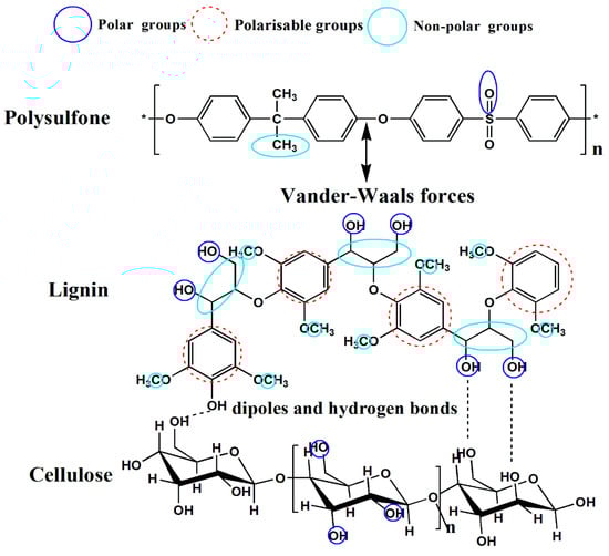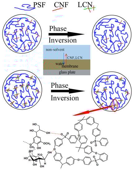 This study investigated how lignin—used as a natural adhesion promoter in cellulose fiber-reinforced composites—influence the ultrafiltration membranes properties. LCN as a hydrophilic additive and mechanical reinforcement material was selected to blend with PSF in a casting solution. Because of the absorption promoter effect of lignin on cellulose adhesion to the membrane matrix, more hydrogen bonds can form between the –OH groups of cellulose and the sulfone groups of PSF, and LCN can firmly assemble within the membrane matrix. In the phase inversion process, the hydrophilic layer is built []. The effects of LCN concentration on morphology and membrane performance are investigated. It is the first time to study the absorption promoter mechanism of lignin on cellulose adhesion to the PSF membrane matrix, which is shown in Figure 1, compared to our previous work []. Moreover, we still need more work to investigate three-dimensional structure of lignocellulose and compatibility mechanism of lignin on cellulose adhesion to the polymer matrix.