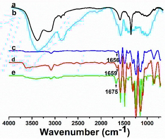 Compared with the spectrum of the pure PSF membrane (Figure 6c), there is a new peak at 3411 cm−1 in Figure 6d,e, which is the characteristic peak of –OH group stretching vibrations []. Compared with Figure 6c, the absorption peaks of PSF/LCN ultrafiltration membrane at 1675 cm−1, corresponding to the stretching benzene ring stretching vibration, became broader and stronger, which indicated that hydrogen bonds were formed between PSF and CNF, and PSF and LCN.