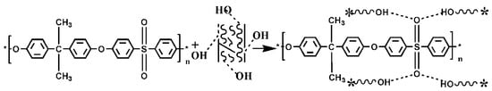 Interactions were revealed because of the shift in the stretching frequencies of the functional groups to higher wavenumbers in the PSF/CNF and PSF/LCN ultrafiltration membranes. The spectra of Figure 6c–e indicate that the sharp band at 1675 cm−1, assigned to ◎ stretching vibrations, was shifted from 1656 to 1675 cm−1. This shift in the stretching frequencies of the PSF/LCN ultrafiltration membrane supports the establishment of hydrogen bonding between LCN and the PSF membrane matrix. The possible interaction and the established hydrogen bond between PSF and LCN as well as PSF and CNF are schematically represented in Figure 7. The schematic of such –OH···O=S=O···OH– interactions implies a good miscibility between LCN and the PSF membrane matrix. The formation of this intermolecular hydrogen bonding favors compatibility and homogeneity at the molecular scale in the PSF/LCN and PSF/CNF ultrafiltration membranes.