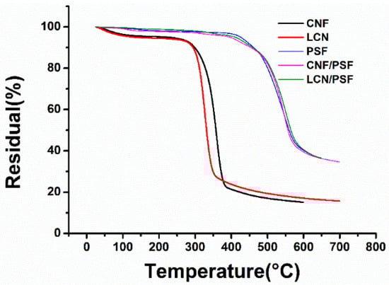 Thermal gravity analysis curves of CNF, LCN, Sample M0 (PSF), Sample M4 (CNF/PSF) and Sample M10 (LCN/PSF).