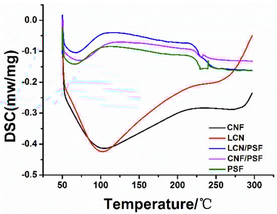 Differential scanning calorimetry curves of CNF, LCN, Sample M0 (PSF), Sample M4 (CNF/PSF) and Sample M10 (LCN/PSF).