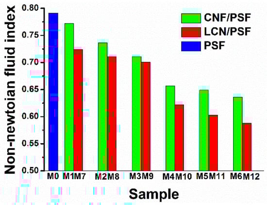 Figure 10 shows the effects of CNF and LCN concentrations on the non-Newtonian fluid index of membrane casting solution. The non-Newtonian fluid indices decreased when the CNF or LCN concentration increased. The non-Newtonian fluid index of the LCN/PSF ultrafiltration membranes was lower than that of the CNF/PSF composites under the same conditions. Moreover, all of the non-Newtonian fluid indices were less than 1, which indicated that both the LCN/PSF and CNF/PSF were pseudoplastic fluids [].