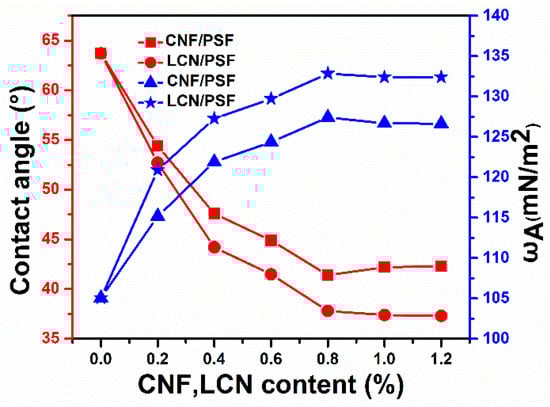 The surface hydrophilicity has a significant effect on the water flux and membrane fouling []. To investigate the surface hydrophilicity and anti-fouling ability of PSF membranes, the angle between a small droplet of water and the flat horizontal surface of the membrane was measured, and the surface energy was calculated. A low contact angle represents a high tendency for water to wet the membrane, a high surface energy and high hydrophilicity [,]. The effect of CNF and LCN of different concentrations on the contact angle and surface energy of hybrid membranes are shown in Figure 11. The contact angle of membranes decreased and surface energy increased with increasing CNF concentrations, indicating increasing hydrophilicity of the composite membranes. The equilibrium contact angle of water decreased from 63.5° on the PSF membrane to 42.1° on the CNF/PSF membrane when the content of CNF was 0.8 wt %. CNF/PSF ultrafiltration membranes showed that the presence of polar functional groups on the surface effectively interacted with water by hydrogen bonding and recorded lower contact angles compared with that of the pure membrane. In addition to the hydroxyl functional groups, the surface porosity also showed an effect on the contact angle, because the water drop could penetrate into the pores because of the capillary action, which decreases the contact angle. The contact angle of the LCN/PSF membrane decreased and the surface energy increased more obviously than those of the CNF/PSF membranes for equivalent concentrations. The results show the effect of the lignin as a chain extender on the compatibility between cellulose and the PSF matrix. More hydrogen bonds formed on the membrane surface, improving membrane hydrophilicity []. After the hybrid membranes were immersed in water for 8 h, the contact angles were retained, suggesting stable hydrophilicity of the ultrafiltration membranes.