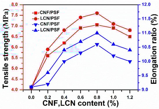 However, the ultimate tensile strength of LCN/PES ultrafiltration membranes increased by 5.6% from 7.2 to 7.6 MPa, the maximum breaking elongation enhanced by 2.8% from 10.7% to 11% and the highest Young’s moduli were also increased by 11.3% from 741 to 825 MPa compared with those of CNF/PSF ultrafiltration membranes. These observations indicate that the presence of lignin improves compatibility of the PSF matrix and cellulose, achieving a better connection between fiber and matrix than that without lignin. Lignin may be accessible for chemical reactions []. This finding indicates that a large proportion of the active groups at the lignin surfaces can react with the –OH groups of cellulose and the sulfone groups of PSF [].