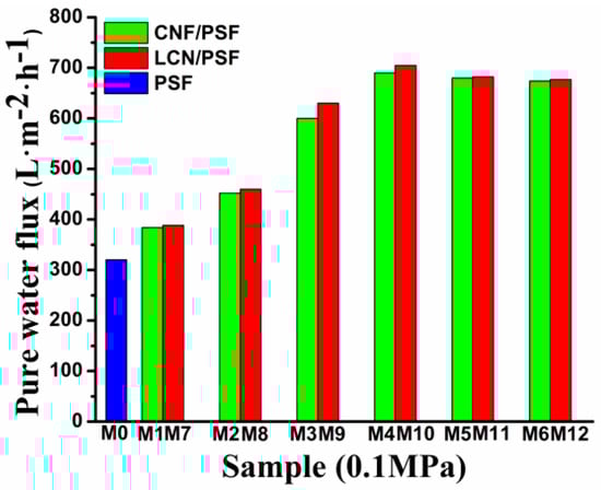 The nanosized hydrophilic additives easily aggregate and disperse non-uniformly in the PSF membrane matrix when CNF and LCN are added excessively, which can cause a decrease in the interfacial strength, decreasing the PWF of the membranes [,,].