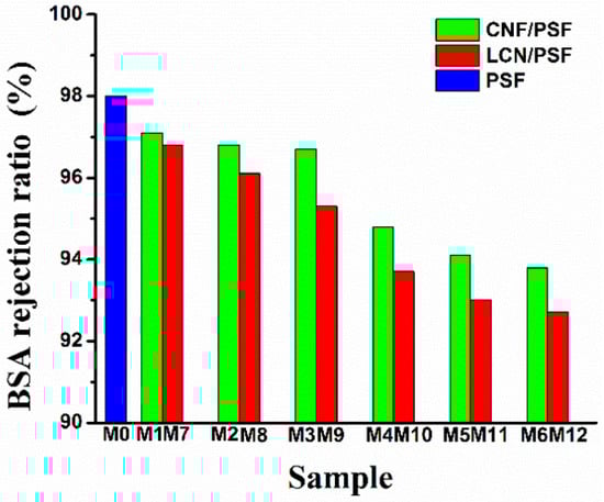 PWF and BSA retention ratio are important properties for ultrafiltration membranes. The effect of CNF and LCN of different concentrations on the PWF and BSA rejection ratio are shown in Figure 13 and Figure 14, respectively. The PWF of membranes increased with the increasing dosages of CNF and LCN compared with that of the pure PSF membrane. The PWF of hybrid membranes reached 723 L/m2/h (with LCN), and 687 L/m2/h (with CNF), whereas the PWF of pure membrane was 319 L/m2/h. The BSA rejection ratios of the membranes slightly decreased with increasing dosages of CNF and LCN compared with that of the pure membrane, retaining a high level from 92.9% to 97.1% with or without lignin.