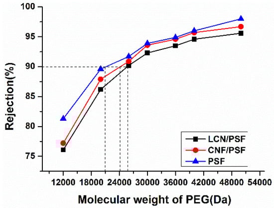 The molecular weight cut-off (MWCO) of the prepared membrane was determined through permeation tests using a group of PEG with molecular weights of 1.2 × 104, 2.0 × 104, 2.6 × 104, 3.0 × 104, 3.6 × 104, 4.0 × 104 and 5.0 × 104 Da as model solutes. The retention rates at 0.1 MPa for the seven different PEG fractions are presented in Figure 15. From the rejection behavior, it is found that the MWCO of the hybrid membranes are about 24,169 and 25,823 Da. From the data listed in Table 5, it is shown that membranes show porosity increase by 73.7% for CNF/PSF membrane and 80.4% for LCN/PSF membrane as compared to that of pristine PSF. The pore size of membranes is about 89.1 to 150.6 nm, which indicate the characteristic of ultrafiltration membranes.