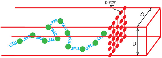 A bead-spring model of semi-flexible chain confined inside a nanochannel of width D being pushed by a sliding gasket piston (nano-dozer). The green beads are connected via anharmonic spring potentials and interact at long-range via excluded-volume. The red wall particles are at a fixed distance from each other on a square lattice and move together at the piston velocity. The chain always remains confined inside the channel.