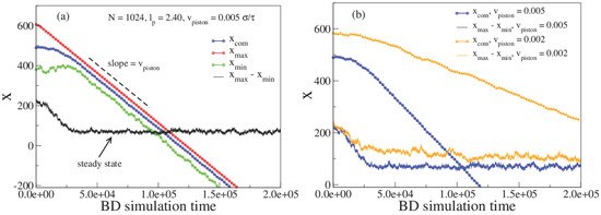 (a) The evolution of the maximum (green), minimum (red) and the x-coordinate of the center of mass (COM) (black) (along the channel axis) during the simulation are shown, the extension of the chain The piston is approached from the side. When the COM’s speed becomes the same as , the steady state of the polymer chain is achieved; (b) The same as in (a) but compares the effect of two different piston speeds 0.005 and 0.002 respectively.