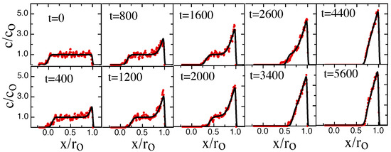 Time evolution of the normalized chain density along the channel axis for various times during compression with a sliding gasket moving at speed . The channel width and the persistence length . Time-values are shown in snapshot units, with one snapshot corresponding to 1000 iterations. The red circles correspond to the BD simulation data; the black solid lines correspond to the fitted prediction from the NPDE model. The NPDE model is solved with a (bond unit squared per snapshot, obtained from the ramp-slope in steady-state); this value leads to a (snap-shot units). The best-fit . The σ values were determined from a fit of a uniform concentration profile model to the profile at . For the edge near the gasket, . For the edge opposite the gasket, .