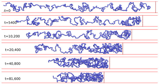 Typical chain configuration snapshots for these times are shown in Figure 5 when the chain density progressively increases. When the steady state is achieved (as evident from the plateau in Figure 2) then the chain is allowed to retract. Figure 6 shows a time-series of chain concentration profiles for this retraction phase.
